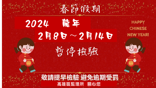 【今傳媒/記者李祖東報導】 113年2月8日(星期四)至113年2月14日(星期三),適逢農曆春節連續假期,本次連假長達7天,高雄區監理所轄區69家代檢廠(包含高雄市、屏東縣、臺東縣及澎湖縣)將不受理車輛檢驗服務,為避免車輛逾期檢驗,請車輛定檢日將屆(行照指定檢驗日前後1個月內;出廠逾10年之營業大客車,應於指定檢驗日前1個月)之車主,預先安排汽車定期檢驗以免受罰。同時提醒車主平日應做好車輛保養工作,以確保行車平安。