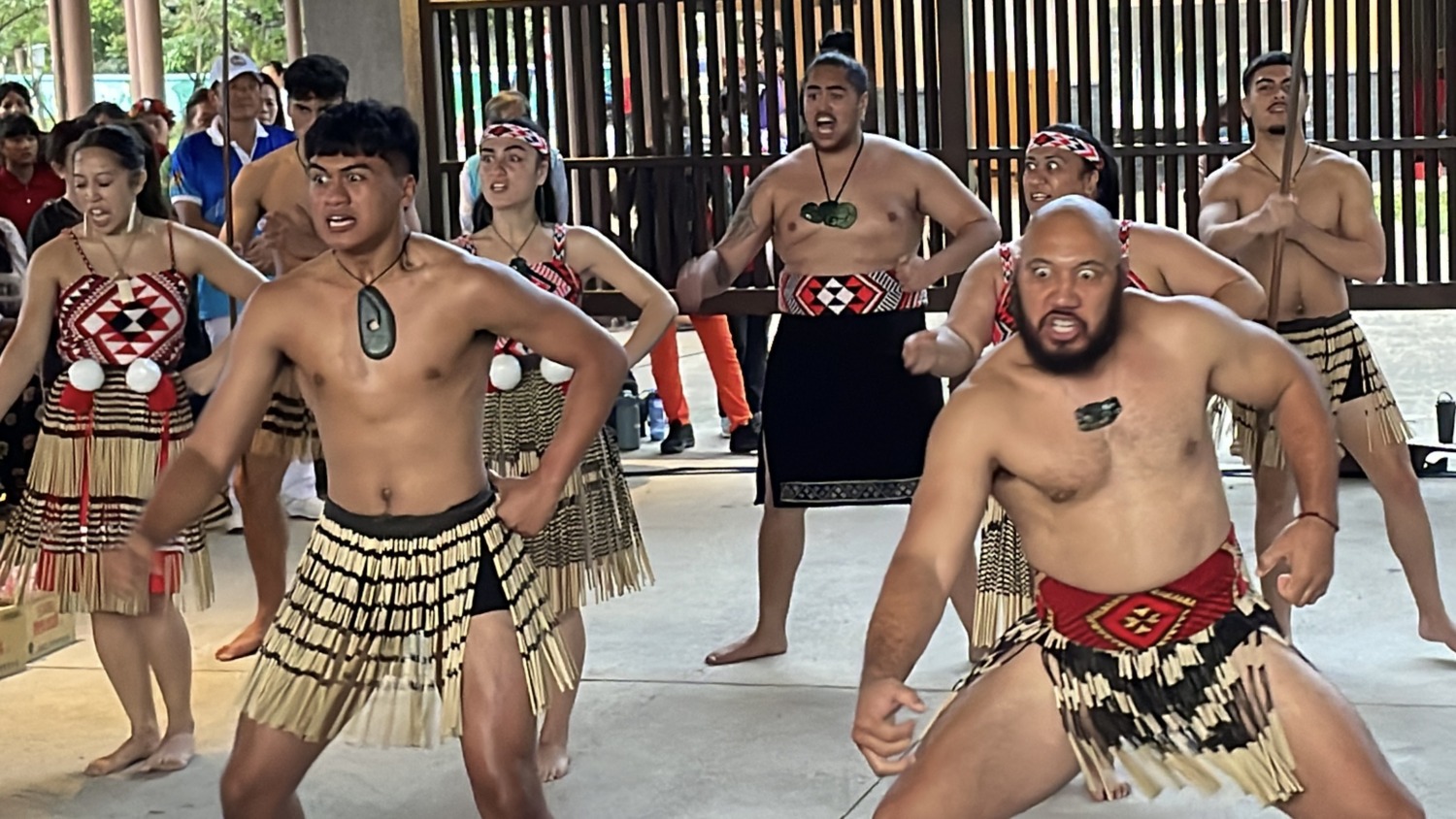 紐西蘭羅托魯瓦市(Rotorua)毛利文化藝術表演團與當地高中籃球隊昨日(17日)到訪新北市金山區,上午與北海岸籃球協會進行跨國籃球交流友誼賽,下午在充滿日式氛圍的中山溫泉公園與新北市金山高中原住民藝能班進行文化歌舞交流。