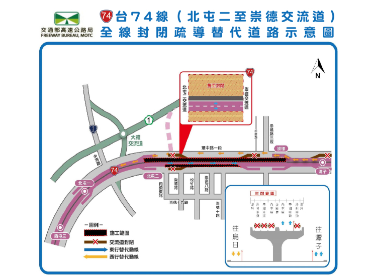 交通部高速公路局第二新建工程分局為辦理國道1號增設銜接臺臺74線系統交流道工程,預計於113年4月27日(星期六)及4月28日(星期日)共2日,每日21時30分至翌日5時30分暫時封閉臺74線14k+500~17k+700(北屯二至崇德間) ,27日封閉西向主線全部車道,並同步封閉臺74線西行向潭子入口匝道、28日封閉西行主線全部車道、東行外側2車道及北屯二出口匝道,並同步封閉台74線西行潭子入口匝道。