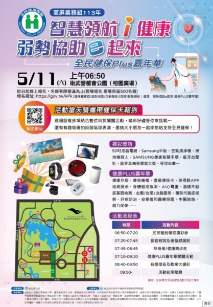 如想進一步了解活動詳情,可參閱健保署網站https://www.nhi.gov.tw/最新消息/活動報名/(高雄)智慧領航i健康 弱勢協助e起來 健保Plus嘉年華。