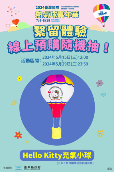 今年的「2024臺灣國際熱氣球嘉年華」將在7月6日至8月19日在鹿野高台盛大舉行,屆時遊客們可以欣賞來自世界各地的熱氣球在臺東高空綻放異彩。除了觀賞熱氣球外,遊客還可以參加熱氣球繫留體驗,這是一個不容錯過的活動。今年的購票方式有現場販售和線上預購兩種,線上預購平台將於5月15日和5月22日中午12點開放預訂。此外,臺東縣政府還搭配HELLO KITTY 50周年活動,提供100顆HELLO KITTY充氣小球作為額外禮物,將隨機送給預購成功並到場的民眾。對於想要搭乘熱氣球俯瞰鹿野大地之美的遊客們來說,趕快記下時間搶票吧!,線上預約平台(https://www.eztravel.com.tw/activity/taitungballoon/)。