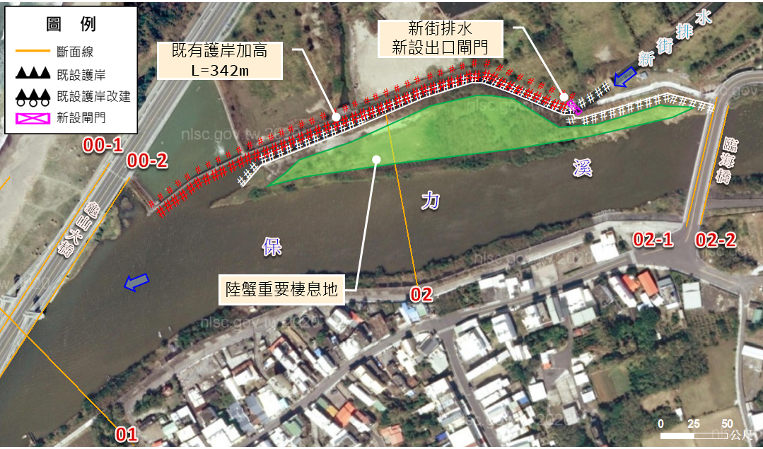 故屏東縣政府於本次治理規劃檢討辦理期間,於113年5月7日於車城鄉公所及恆春鎮公所辦理地方說明會與議與在地人士及關心環境團體討論,針對本河段之治理,改以加高新街排水右岸既有防洪牆放寬河道外,並配合防洪牆位置設置新街大排出口自動閘門避免外水沿回壅。而為避免影響現況陸蟹棲息熱點環境之完整性,本次規劃工程配置配合堤後公有地及未登錄地予以放寬並採緩坡化型式規劃。