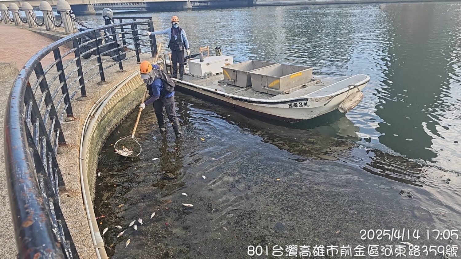 為盡速清理河面魚屍,環保局溝渠清疏隊近二日共動員5船次、12人次,打撈850公斤,已將河面死魚清除完竣,明(15)日將持續加強河面巡檢及上游污染源稽巡查作業。