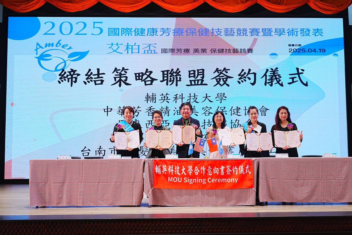 林惠賢隨後代表學校與中華芳香精油美容保健協會吳奕賢理事長、MIVA馬來西亞國際技職協會劉玉燕署理會長、台南市美髮及美容美體業產業工會鄭玉娟理事長、艾柏學院銀杏樹能量美學館蔡銀杏執行長及芳軒美學股份有限公司施麗卿董事長等簽訂MOU,強化未來合作交流。