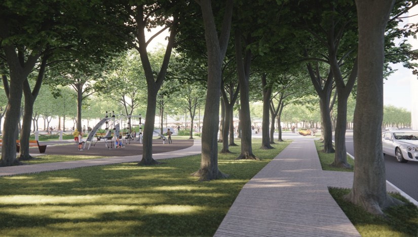 本工程將新植喬木與灌木,並更新噴灌系統,打造綠意盎然的綠色廊帶,以提升綠覆率與固碳效能,進一步淨化空氣,營造更優質的居住環境,園區內原有的密林區亦將保留,同時修繕水岸步道,包含1條環狀步道、5條出入口步道及9條橫向串聯步道,並更新照明設備,方便民眾行走及休閒運動安全。另針對布里斯本公園也將進行整體環境改善工程,除保留現有大型喬木外,既有鋪面、樓梯、座椅等硬體設施於本工程進行減量,保留主要人為活動廣場及穿越性動線後,將拆除部分閒置空間改為透水綠帶,藉以提升綠色基盤範圍,增加公園透水面積、減少地表逕流,綠廊斷點處新植喬木,提升河堤公園廊帶串聯,打造都市生態跳島,期望延續前期愛河水環境計畫持續改善擴張整體性的水岸環境。