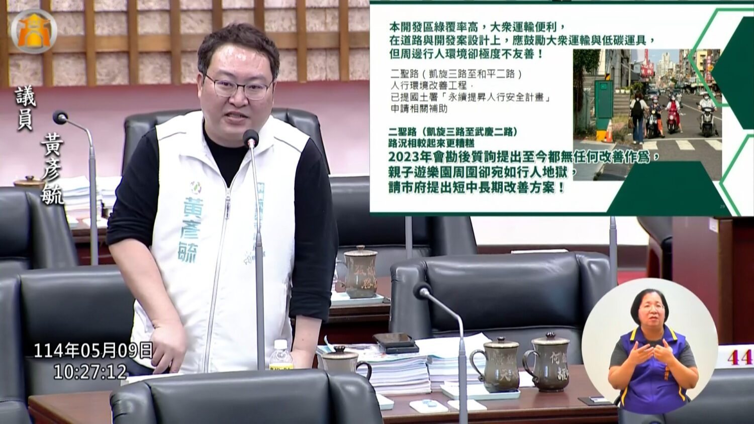 在城市通行環境部分,黃彥毓質疑市府對二聖路的整併進度。他指出該路段是高雄機廠園區、親子設施、捷運與輕軌的重要聯絡幹道,但人行空間被電桿、站牌與設施擋道,完全無法稱為友善。建議比照正義路模式進行地面與地下設施整併,提升行人通行安全與市容。