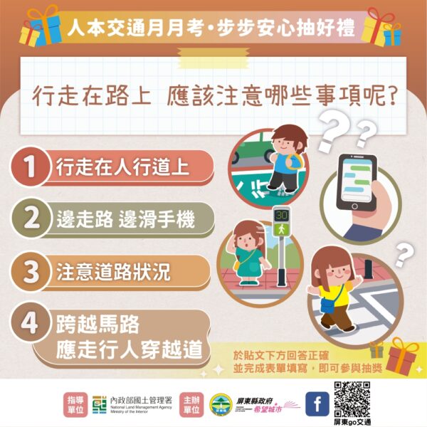 【今傳媒/記者李祖東報導】為持續推動安全、友善的行人通行環境與觀念,屏東縣政府將於今年5月至7月期間,每月於「屏東go交通」官方粉絲專頁推出「人本交通月月考」線上抽獎活動,以簡單、生活化的知識問答,鼓勵民眾學習正確用路行為,養成人本交通意識,共同打造更安心的行人環境。