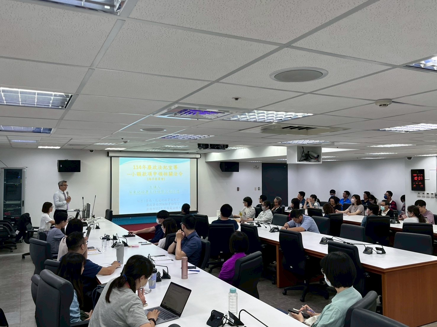 蔡主任檢察官以輕鬆詼諧的方式,從法律條文到實務案例層層剖析執行重點,並進行有獎徵答激發討論,深入淺出引領同仁瞭解公務上實用之防範知識,課程內容精彩豐富,深獲與會人員熱烈共鳴。