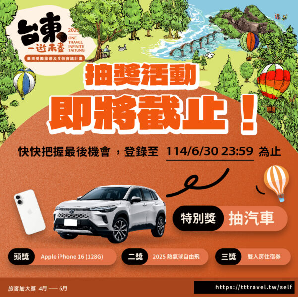 夏日出遊正夯,台東縣政府推出的「台東一遊未盡」抽獎活動也廣受好評,自活動開跑以來吸引大量旅客參與登錄,感受台東山海之美的同時,也有機會把多項精美好禮帶回家!活動即將於6月30日截止,縣府交通及觀光發展處提醒尚未登記的旅客請把握最後機會,立即上網登記參加抽獎,讓台東之行不只留下美好回憶,更可能獲得驚喜大獎!
