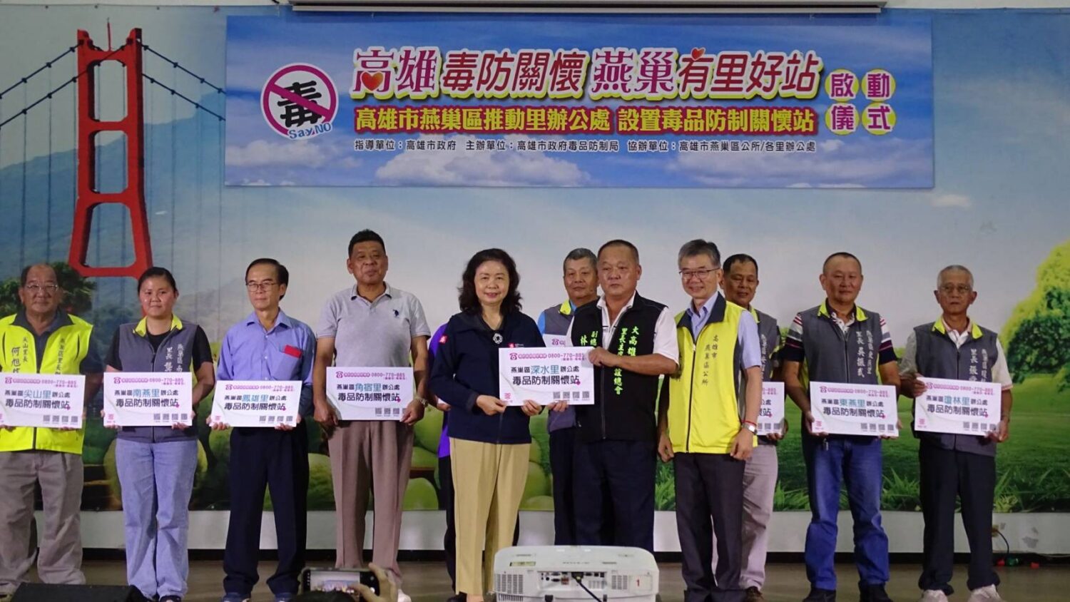 啟動儀式中由毒防局陳盈秀局長親自頒發「里辦毒防關懷站」站牌予燕巢區11位里長,由林明雄里長主席代表受頒,林志誠、黃秋媖議員本人親自出席支持,邱議瑩、林岱樺立委代表、在地議員陸淑美、方信淵、宋立彬議員代表、岡山分局偵查隊副隊長、燕巢區各級學校校長、社區發展協會理事長、調解會、婦參委員亦到場支持這場反毒儀式。毒防局陳盈秀局長、燕巢區公所吳進興區長、林明雄里長主席也率領所有里長及鄰長、志工及逾300位里民熱情參與共同見證這個歷史時刻。活動現場氣氛熱絡,燕巢區里民都前來學習毒品防制知識,熱情參與專業藥師宣導與有獎徵答。