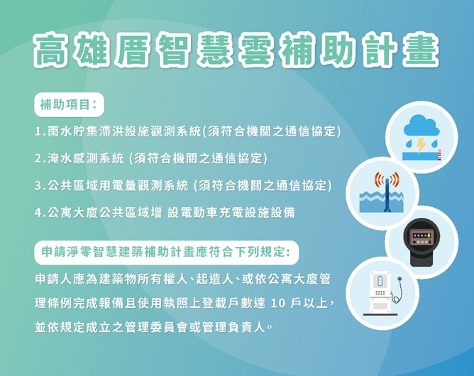 工務局表示,為加速既有建築導入智慧設備以提升都市韌性,高雄市政府自109年起開辦「高雄厝智慧雲補助計畫」,迄今已補助27處場址61項設備完成設置,針對雨水貯集滯洪設施觀測系統及公共區域用電量觀測系統提供每案10萬元以內依實際設置費用全額補助,超過10萬元則以比例補助;淹水感測系統12萬元依實際設置費用全額補助,公寓大廈公共區域增設電動車充電設施設備則補助為工程款的49%,全部補助項目最高均以20萬元為限,公寓大廈可一次申請全部補助項目,最高每案補助80萬元。