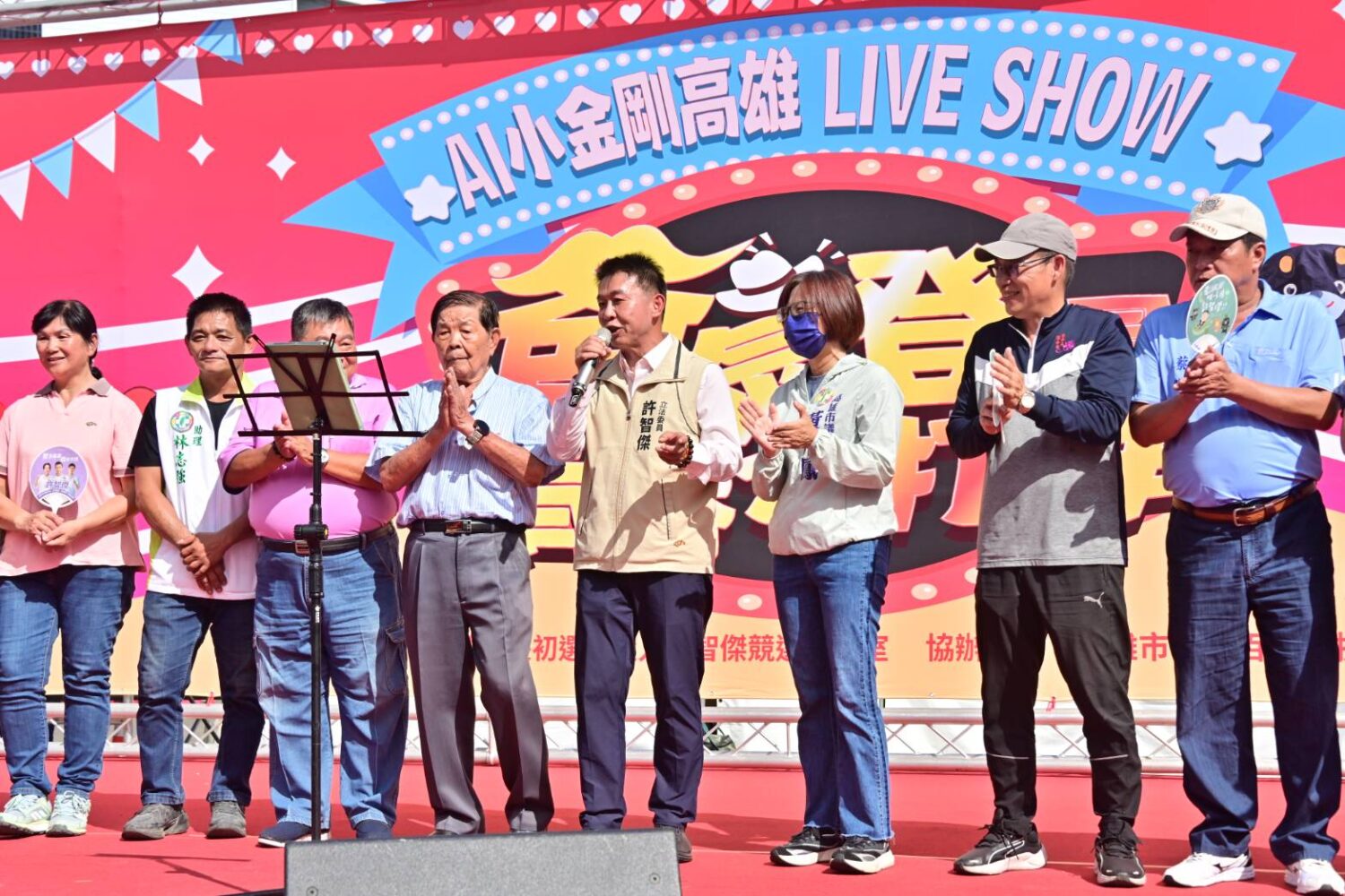 許智傑今(9)日前進市境之南的林園區,選在當地信仰中心廣應廟(王公廟)舉辦【爸氣登場 青春不打烊──AI小金剛 高雄Live Show】活動,邀請張秀卿、陳孟賢、龍千玉、劉福助、喬幼、草屯囝仔等重量級歌手輪番開唱,並規劃市集與氣墊城堡,現場吸引跨越老中青三代的鄉親參與,廟埕人潮滿滿、氣氛熱鬧。