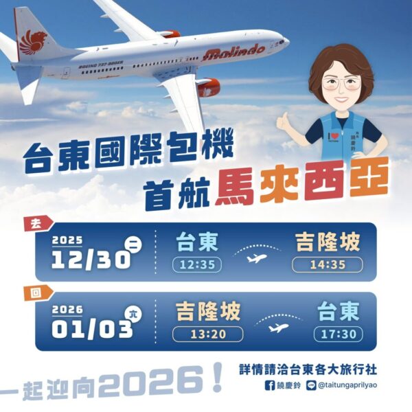 台東縣政府積極開拓包機直航再傳佳音,縣府與華府旅遊集團、峇迪航空(Batik Air)攜手合作,推出「台東—馬來西亞」五日遊直航包機航線,並將於12月30日盛大開通,帶領台東旅客直抵異國風情,暢遊文化與自然景致兼具的旅遊勝地,有意願的鄉親可洽詢台東各大旅行社。
