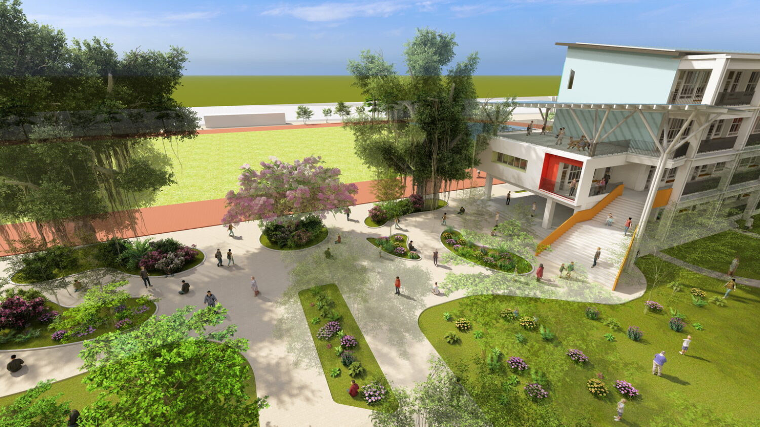 工務局長楊欽富表示,新教學大樓的設計以「以屋就樹」為核心理念,強調配合校內原有樹木進行建設,而非砍除樹木後再新建。設計將保留原有校區大部分榕樹與菩提樹群,並在周圍規劃為戶外教學場域與特色生態教室,讓學生能在樹蔭下上課、討論與交流,更貼近自然,讓學習變得更豐富且有趣;此外,為串聯校園整體動線,並呼應鄰近路竹科學園區的科技氛圍,規劃兼具遮蔭與通透性的半透明風雨走廊,當陽光灑落,走廊呈現如「光子」穿梭電路的視覺效果,展現濃厚科技感,也象徵知識的流動與傳遞。