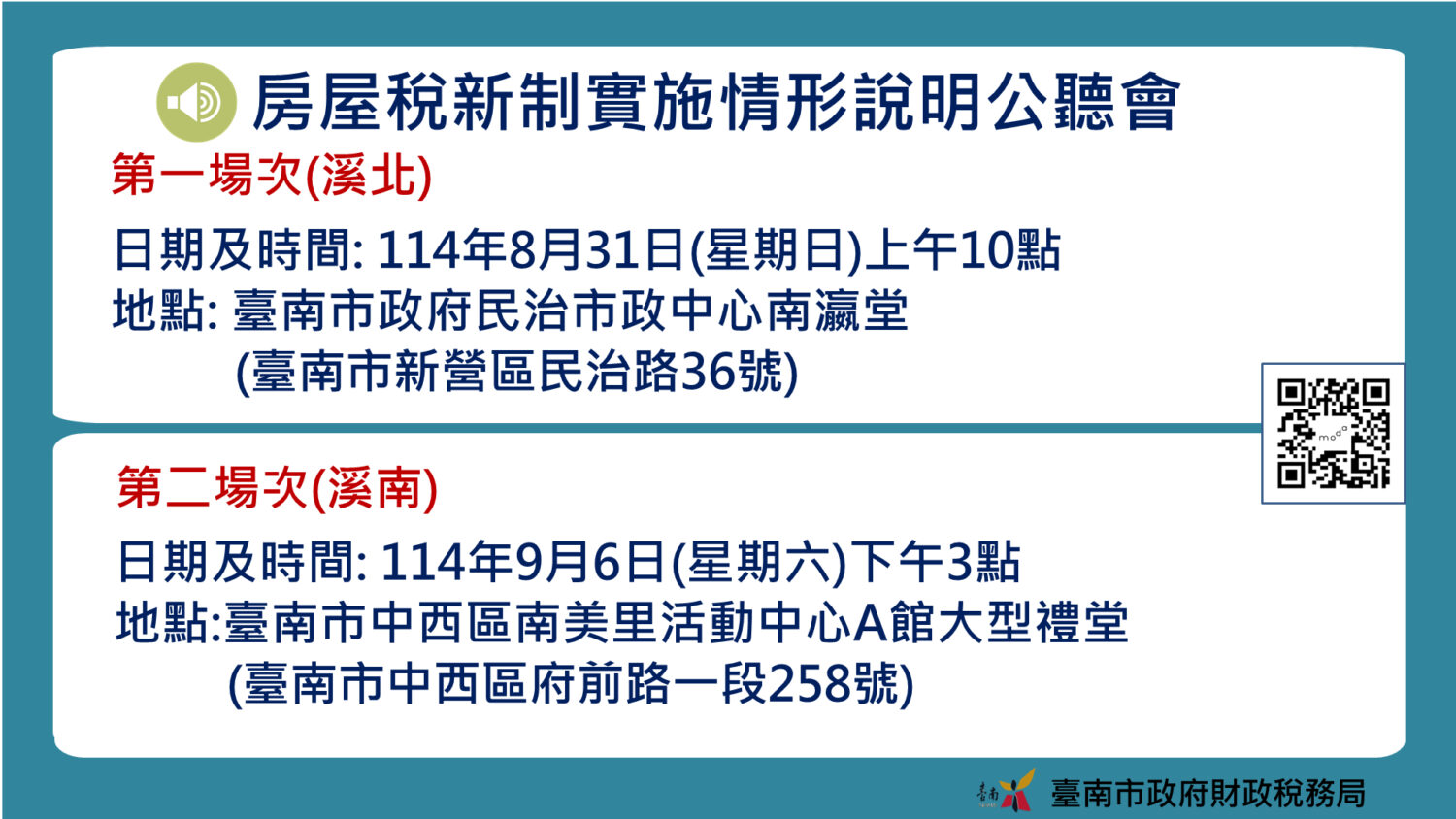 財稅局將接續將在114年9月6日(星期六)下午3時辦理第二場公聽會,地點為中西區南美里活動中心A館大禮堂。因場地人數有限,為便利不便到場的市民朋友關注新制內容,本次公聽會將同步於財稅局臉書粉絲專頁進行線上直播(網址為https://www.facebook.com/tntb100)。