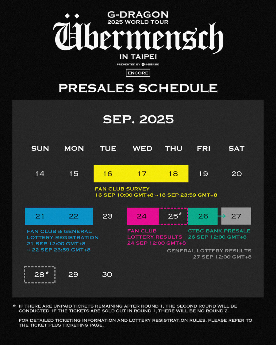 此次台北安可場將以國際級規格重磅打造全新舞台,承接世界巡演氣勢,為台灣觀眾帶來更極致的視聽震撼!售票則全面採「實名登記抽選」制,G-DRAGON官方會員網站Survey登記時間為9月16日(二)上午10點至9月18日(四)晚間11點59分;遠大售票系統則於9月21日(日)中午12點至9月22日(一)晚間11點59分開放會員與一般粉絲登記。官方會員抽選結果將於9月24日(三)、25日(四)陸續公布,中國信託卡友則享有9月26日(五)優先購票時段;後續一般抽選與二次抽選則分別在9月27日(六)、28日(日)進行,若有未結帳票券將再釋出。