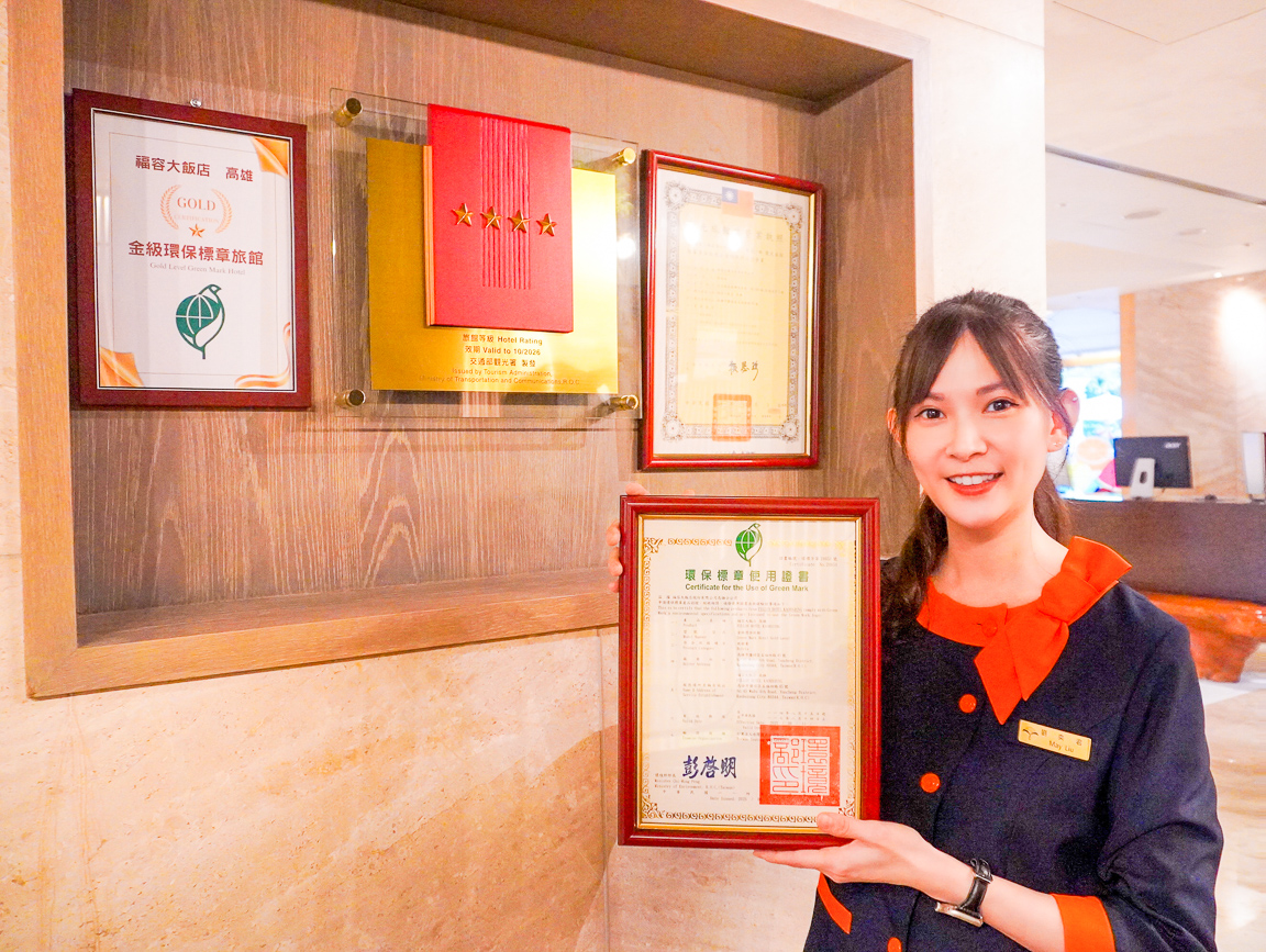 〔今傳媒/記者張忠義報導〕福容大飯店高雄店再度奪下綠色里程碑,近日榮獲「金級環保標章」肯定,展現多年來在節能減碳、綠色餐飲與環保行動上的成果。飯店長期推動環保政策,全館採用節能燈具、省水標章馬桶、高效率空調設備,並導入減塑措施、優先採購環保標章及FSC認證產品;餐飲端則積極響應環保政策,為高雄市第一家率先取得「綠食飯桌」認證的飯店餐廳,優先使用國產食材,向大眾推廣惜食理念,讓旅客在享受美食同時也能支持永續。