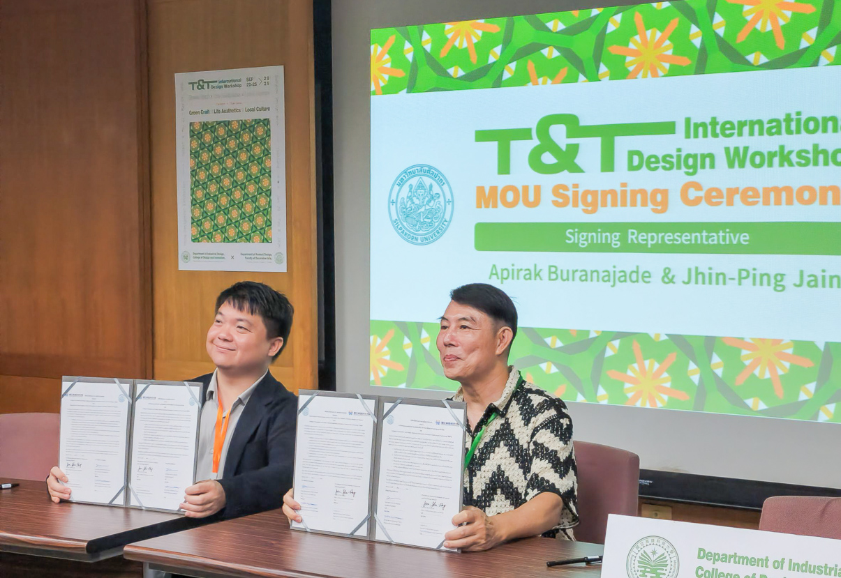泰國藝術大學在國際藝術與設計教育領域享有盛名,此次MOU的簽署不僅象徵兩校的信任與承諾,更是攜手推動設計教育與文化交流的重要里程碑。翟治平院長於致詞時指出,兩校的合作將持續聚焦在地文化研究、社會議題關注與設計教育深化,並透過作品展演展現跨國交流成果;工業設計系林龍吟主任也表示,這場合作不僅是教育交流,更是文化對話,期待學生能在跨文化設計實踐中拓展專業視野,並以設計回應當代社會需求。展望未來,兩校不僅將延續國際設計工作營,並已規劃於2026年1月攜手參與泰國曼谷設計週,5月再共同於台北新一代設計展策展,全面展現跨國合作的成果與影響力。