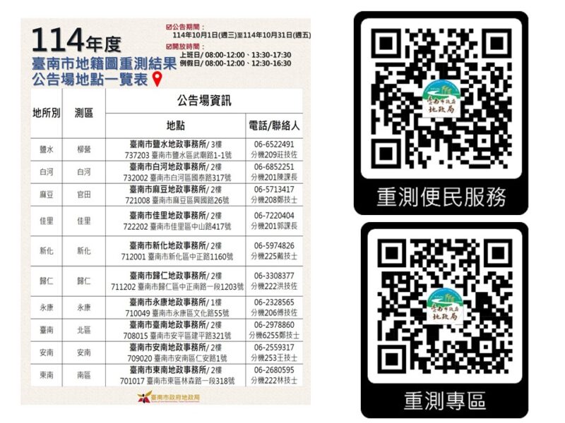 【今傳媒/記者張淑慧 報導】臺南市政府地政局本(114)年度地籍圖重測結果自10月1日起至10月31日止辦理公告,重測結果通知書都以掛號寄送給各土地所有權人。市府提醒:公告期間,所有權人可以攜帶重測結果通知書與身分證,於上班時間前往土地所在地之地政事務所閱覽重測成果,例假日下午閱覽時段為12時30分至16時30分。市長黃偉哲呼籲,請所有權人務必把握公告時段親自確認重測結果,或透過「重測便民服務查詢系統」(https://cris-nlsc.moi.gov.tw/crishome)直接上網查詢重測結果,以守護自身權益。