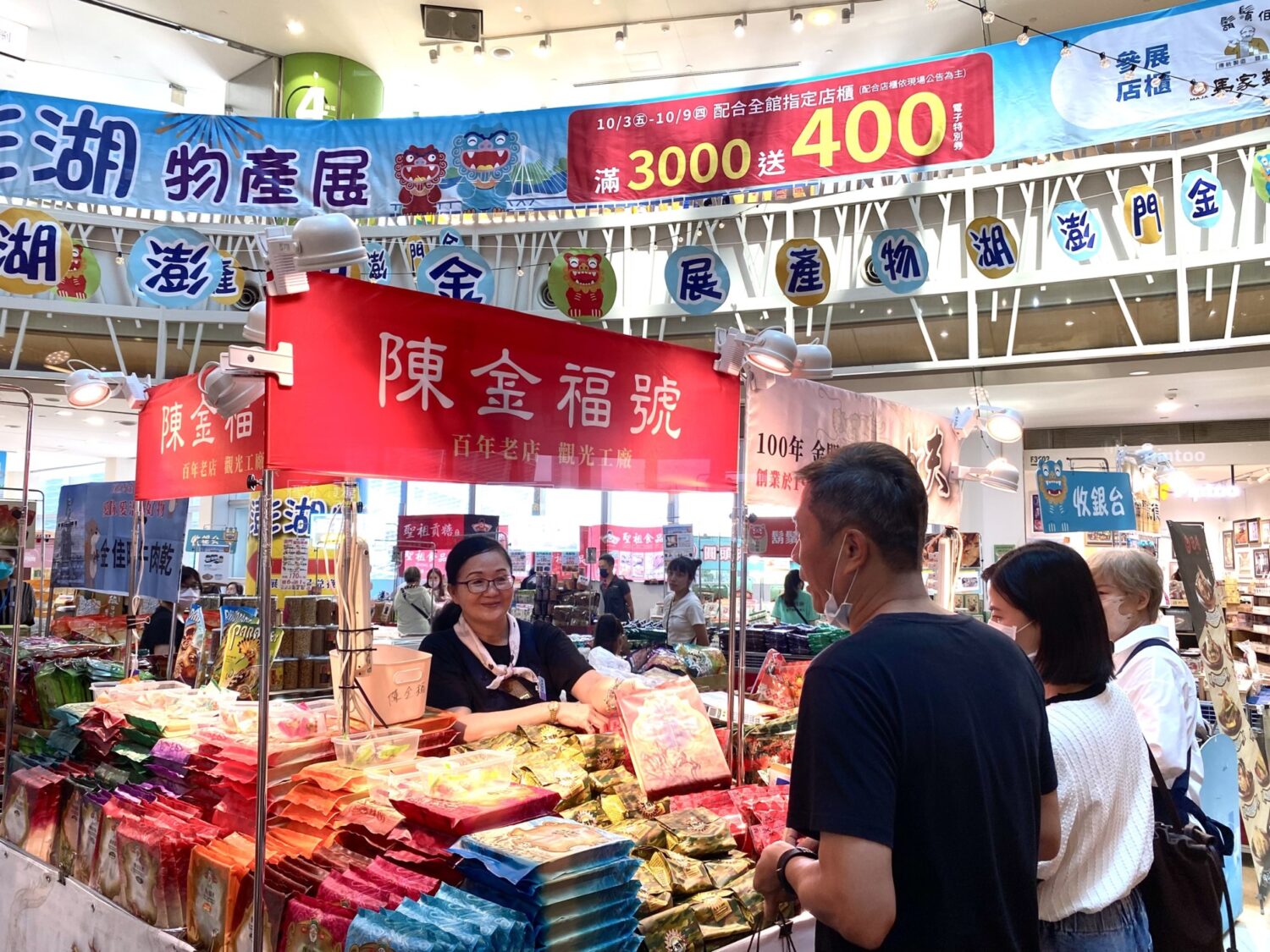 為回饋消費者,展場也推出首四日(10/3~10/6)專屬優惠,「金門蟹老闆」戰地泡菜系列600g原價1罐320元,特價買一送一(限量100組)、「香蜂一條根」一條根茶30入,原價1盒750元,特價3盒2,000元(限量30組)、「金永利鋼刀」電木刀組禮盒原價3,000元,特價2,640元還贈刨刀乙支(限量20組)、「圓頭肉乾金門酒糟牛教父」100%金門酒糟牛肉乾原價1包280元,特價4包1,000元。活動期間更有「澎湖富勝」淡味小管醬、「黑妞澎湖名產」黑妞海之饌干貝XO醬、「天之桂貢糖」古早味綜合糕等商品買一送一超值好康,歡迎大家前來選購!