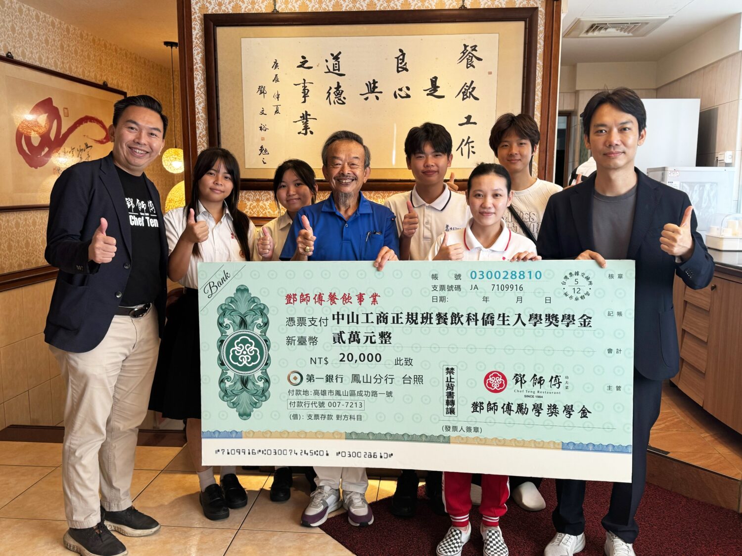 鄧師傅餐飲事業中秋節前夕頒發獎學金給五位中山工商餐飲科正規班僑生,僑生為感謝鄧師傅扶弱拔尖之恩,由餐飲科老師協助手作月餅禮盒回贈,八種口味都有意涵,例如桂圓鳳梨口味甘甜中帶酸,象徵幸福與希望,祝福鄧師傅全體員工生活豐盛美滿。
