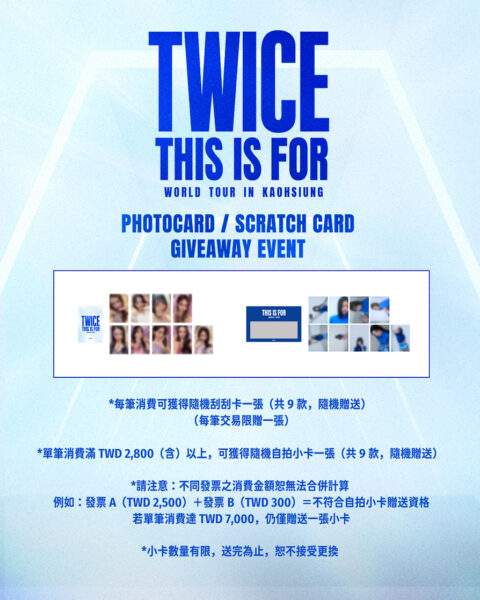 為回饋一路支持的ONCE,特別打造TWICE WORLD TOUR POP-UP STORE IN KAOHSIUNG巡迴快閃店,將於義享時尚廣場1F登場(地址:高雄市鼓山區大順一路115號1F)自11月15日至11月24日限時舉辦,營業時間平日為11:00-22:00,假日為10:30-22:00。快閃店不僅帶來巡迴周邊、時尚單品與精緻收藏品,更特別推出限量滿額回饋活動-凡於現場單筆消費達指定金額,即可獲得限定版小卡。所有商品與贈品皆為限量供應,數量有限,邀請ONCE們把握難得機會!