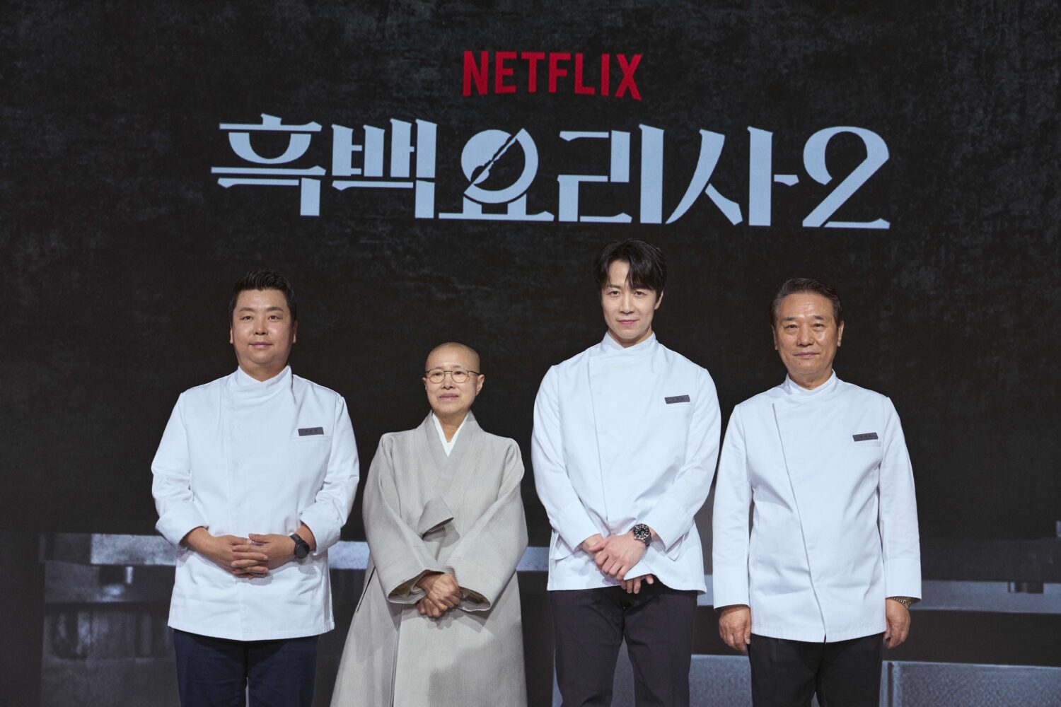 圖/鄭鎬泳主廚(左起)、善財法師、孫鍾元主廚與侯德竹主廚現身Netflix《黑白大廚:料理階級大戰》第2季首爾記者會。Netflix提供