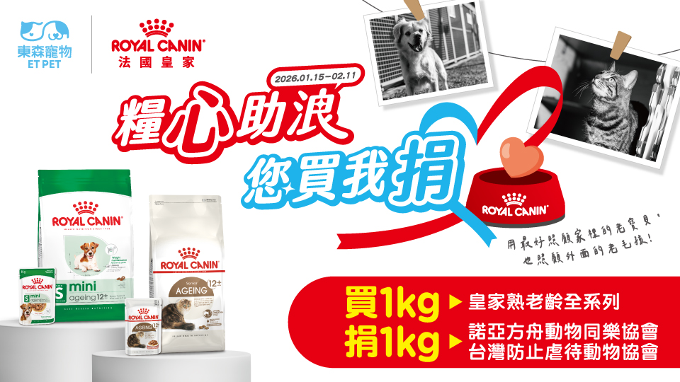 【今傳媒/記者張淑慧 報導】隨著寵物高齡化趨勢加劇,熟老齡貓犬的照護需求日益受到重視。寵物健康營養專家法國皇家今年將二度攜手全台最大寵物連鎖通路東森寵物,於1月15日至2月11日啟動「糧心助浪」公益捐糧活動。消費者凡於東森寵物門市購買法國皇家熟老齡系列飼料,品牌即「買一捐一」,等量捐贈對應公斤數飼料予「諾亞方舟動物同樂協會」及「Taiwan SPCA台灣防止虐待動物協會」。本次預計捐贈2,300公斤,以精準營養支持老病殘浪浪的生活品質,落實「尊重生命、終養不棄養」的理念。