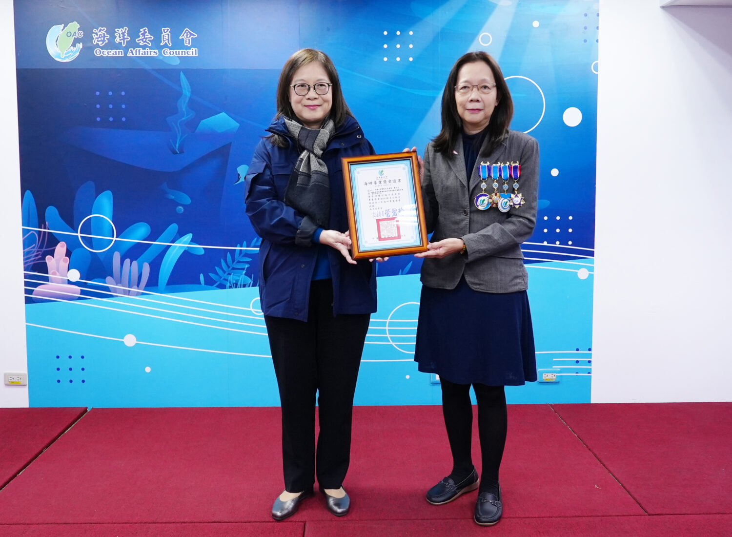 海洋委員會黃向文副主委即將於明日(1/16)卸任,海委會上週五由管碧玲主委親授最高榮譽之「海洋、海巡、海育、海研」共四項一等專業獎章。管碧玲主委祝賀黃向文副主委卸任並感謝她的卓越貢獻,細數黃向文從三人開始草創海保署,推動《海洋保育法》從無到有,深度參與我國海洋保育與治理制度建構,並盛讚黃向文是她最重要的專業夥伴。