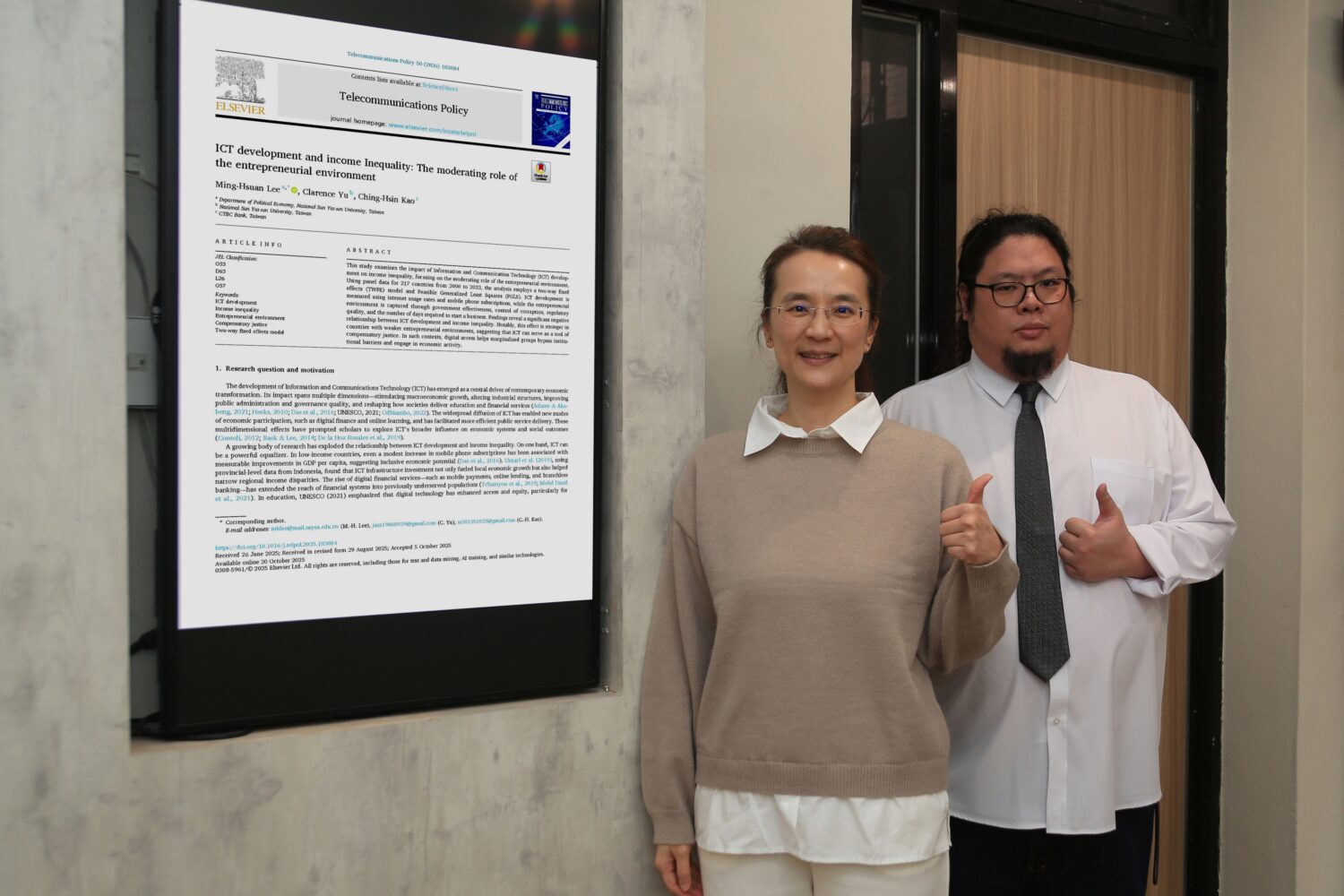該研究為ICT影響提供關鍵實證,獲登世界頂尖期刊「電信政策」(Telecommunications Policy)。分析結果顯示,無論在高或中低收入國家,ICT發展與貧富差距程度皆呈顯著負相關,代表提升數位近用性可改善收入不均。而在資本市場運作高效、政府制度有效、監管體系促進創新的高度發展創業環境中,ICT對低收入群體的邊際效益可能有限,因為已有機制促進向上流動。而在政府效能不足、行政程序冗長、貪腐與監管效率低下的創業環境薄弱國家中,ICT可作為補償工具,讓使用者直接透過網路平台、行動支付工具與社群媒體觸及市場與顧客,形成替代性的經濟參與途徑,縮減貧富不均的效果更為明顯。
