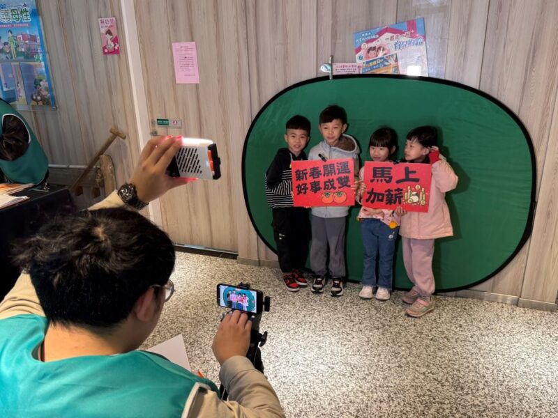 為推廣CH3公用頻道,北健在現場打造簡易攝影棚,以「吉祥話傳祝福、在地聲音迎新年」為主題,邀請竹圍社區發展協會「十二金釵」、在地幼兒園小朋友等輪番上陣,站到綠幕前,拿著春聯,向鏡頭揮手拜年,留下難忘的新春回憶。大園區長余誌松也親自入鏡,手持書法家李詩鐘所寫的「神馬」春聯,向鄉親表達感謝與祝福。他笑說,每年揮毫活動總是人潮滿滿,春聯幾乎「秒殺」,也感謝北健帶來錄影體驗與媒體識讀活動,讓年節活動更加豐富有感。