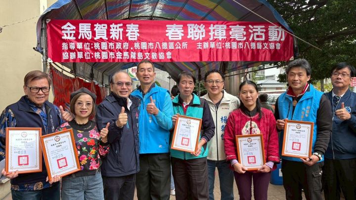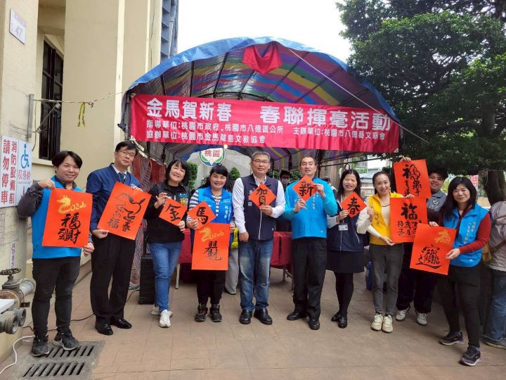 【今傳媒/記者彭慧婉報導】桃園市八德區公所與桃園市八德藝文協會於2月5日上午9點30分至下午12點30分,在八德區公所前廣場共同舉辦「金馬賀新春」春聯揮毫活動,由名師現場揮毫贈送春聯。市議員楊朝偉、朱珍瑤,以及立委邱若華、議員呂林小鳳、許家睿與段樹文服務團隊均一同蒞臨現場,陪伴市民朋友一起迎接嶄新的一年,增添年節韻味與溫暖。
