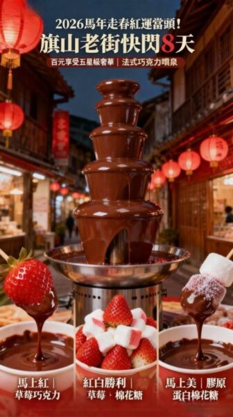 〔今傳媒/記者張忠義報導〕高雄旗山老街今年會出現全台少見的 五層法式巧克力噴泉,原裝進口設備現場運轉,濃郁巧克力如絲緞般層層流動,視覺吸睛、香氣四溢,吸引不少民眾駐足圍觀、拍照打卡,將成為春節期間老街最受矚目的甜點焦點。