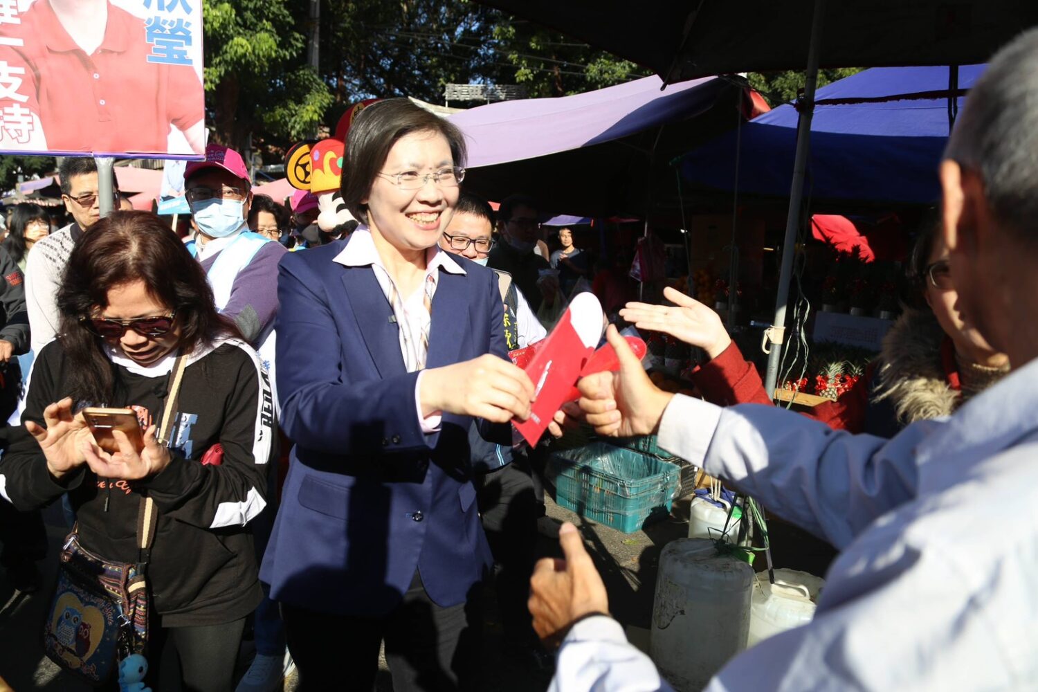 竹東市場是當地的傳統市場,也是全台灣規模最大的客家市集。作為客家妹的徐欣瑩在年節前夕來到熟悉的客家鎮,鄉親們也給熱情回應,現場高喊「高票當選」、「客家人挺客家妹」,還有老闆娘當起麥克風手高喊凍蒜,展現徐欣瑩在竹東地區的超高支持度。