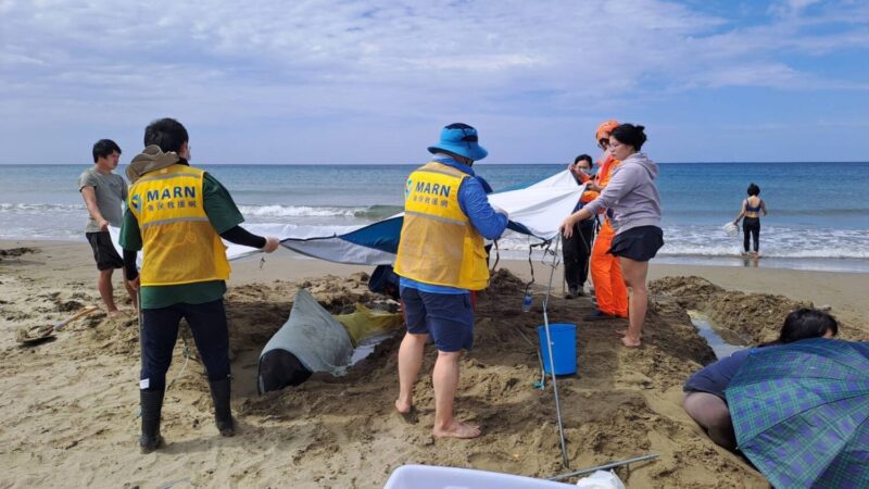 今(24)上午8時,海保救援網(MARN)接獲海巡署第六岸巡隊通報,民眾在屏東縣車城鄉海口沙灘發現11隻鯨豚擱淺,接獲通報後,本署即依救援機制啟動應變程序,迅速聯絡救援團隊前往現場處置。