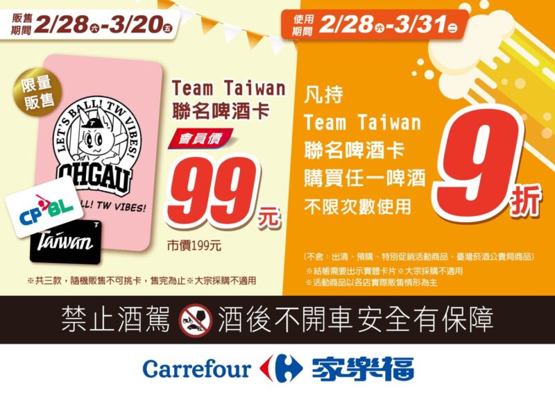 特別是家樂福會員在新年前達消費滿額所獲得的現金折價券,3月8日前可消費折價使用!再一波金色補給泉水,加碼家樂福會員專屬「家樂福x Team Taiwan聯名啤酒卡」會員價只要99元(市價199元),三款限量卡面隨機販售,2月28日~3月20日啤酒卡限量販售,3月31日前不限使用次數,購買啤酒結帳出示啤酒卡享9折優惠,包含檔期推薦啤酒也適用。(此啤酒卡不適用大宗採購,且不含:出清、預購、特別促銷活動  商品、臺灣菸酒公賣局商品)