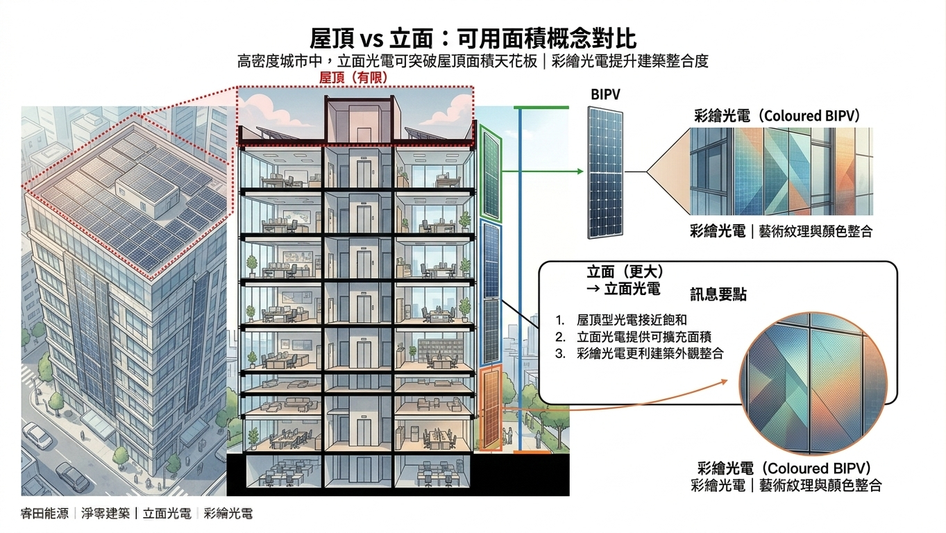 • 屋頂資源天花板浮現:立面光電為高密度城市擴大再生能源提供新路徑。