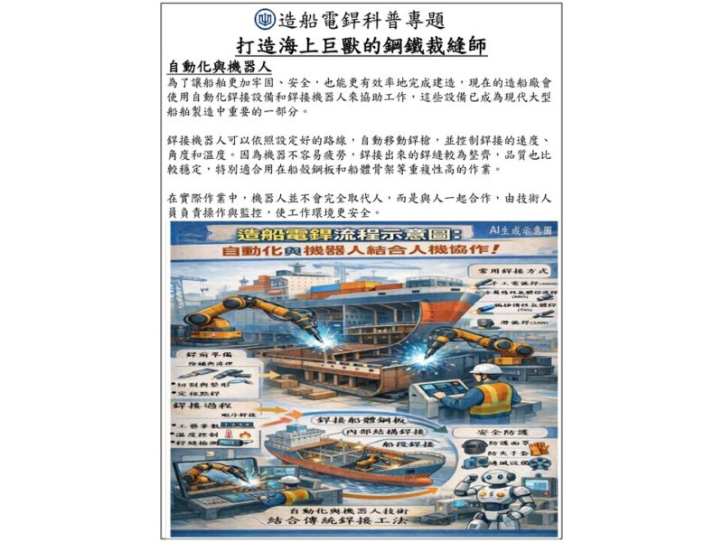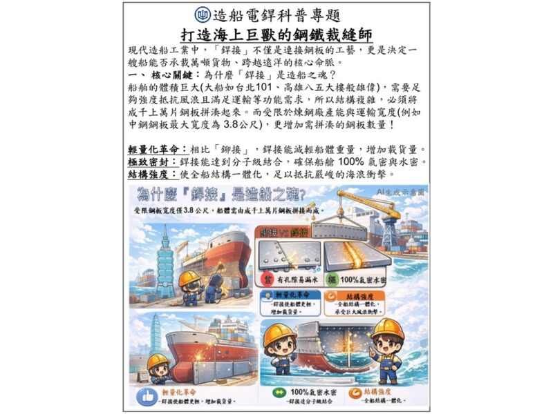 台船公司推出造船科普圖卡,聚焦電銲,介紹焊接流程與安全要點,帶民眾認識工藝,支持台灣造船產業。