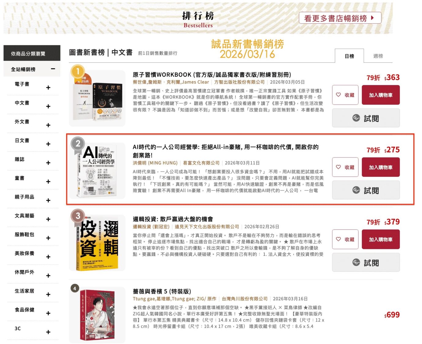 【今傳媒/記者張淑慧 報導】新書《AI時代的一人公司經營學:拒絕All-in豪賭,用一杯咖啡的代價,開啟你的創業路!》於2026年3月11日上市,上市一週內即在兩大通路榜單表現亮眼,分別拿下博客來暢銷榜商業理財類第2名,以及誠品新書暢銷榜第2名。 該書在博客來的排名僅次於《納瓦爾寶典》,並超越《原子習慣WORKBOOK》等長期熱銷書,顯示其市場關注度快速攀升。觀察此次榜單成績,能在博客來與誠品兩大通路同步站穩前2名,反映台灣讀者對AI時代下「個人創業」與「一人公司經營」相關議題的高度需求,也帶動商業理財類新書的討論熱度。