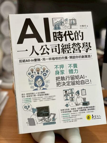 洪儒明本身並非理工背景,不會寫程式,也不會繪圖設計。他花了半年自學 AI 工具,完成了 LINE 貼圖上架、專案企劃提報、從零建置網站…等,這些過去得靠一整個團隊才推得動的事。他在書中強調:「一人公司不是一個人做完所有事,是一個人掌控整個系統。」
