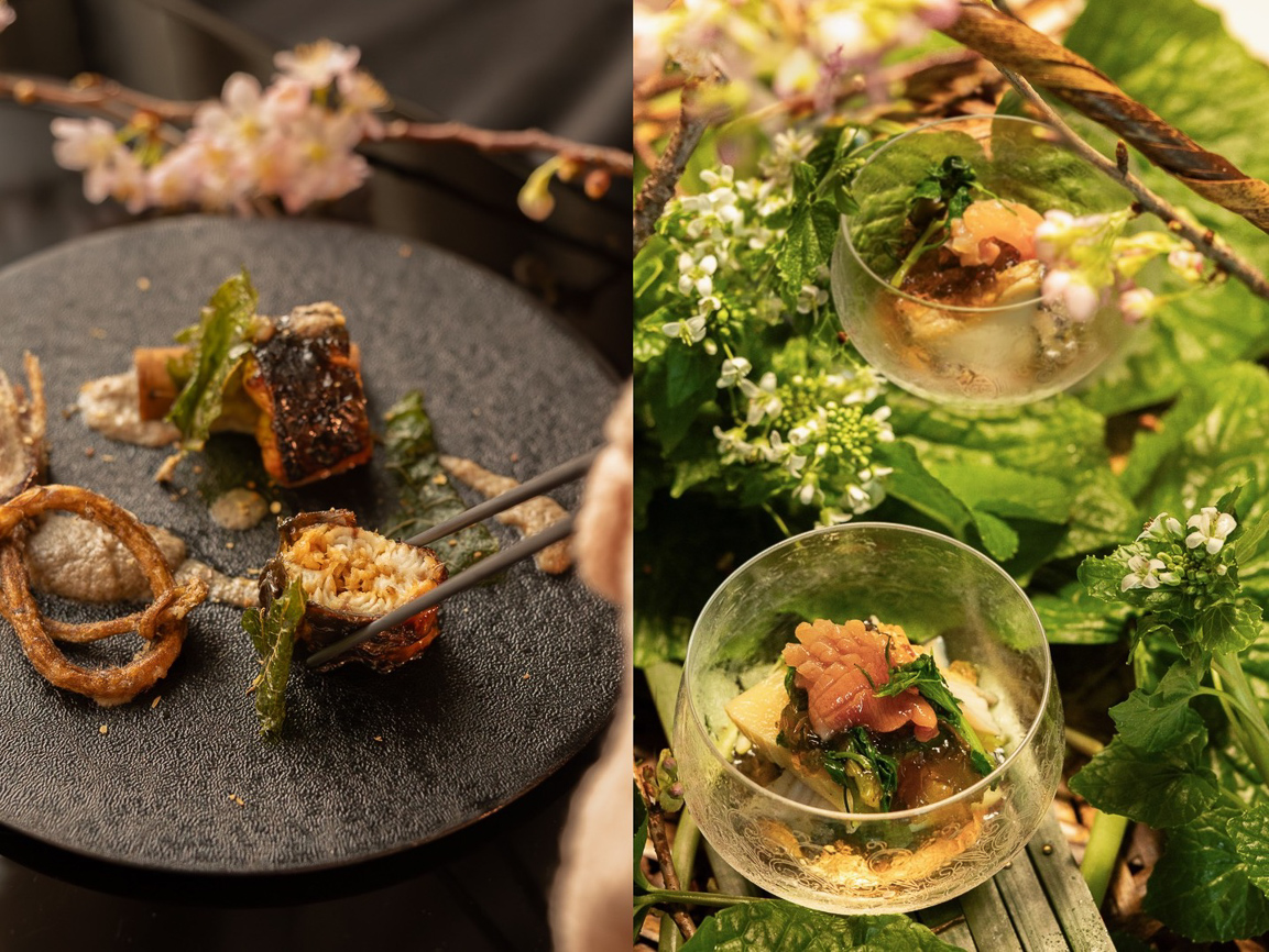 Ukai Kaiseki懷石以細膩節奏呈現春天的山海景致。「春貝鮑魚山葵葉」以生赤貝的爽脆與煮鮑魚的柔韌為主角,搭配阿里山山葵葉與加減醋晶凍,貝類鮮甜與山葵清辛交會,清新開啟味蕾。特別的是,此道料理以櫻花與枝景點綴,盤面宛如阿里山春景。「親子牛蒡醬燒鰻魚」則以醬燒鰻魚搭配牛蒡天婦羅、牛蒡泥與熟成牛蒡,展現酥、嫩、甜、香與土壤芬芳交織的層次。「煙燻富士樽魚」選用富士伏流水養殖鱒魚,以肉桂煙燻帶出淡雅辛香,搭配山葵菜沙拉與恆春新洋蔥醬汁,呈現煙燻香氣與春日清甜的平衡。鍋物「海瓜子.三葉芹.蕪菁」則以海瓜子與蛤蜊慢火熬製清澈湯底。春季正值貝類最肥美時節,湯頭鮮甜透亮,三葉芹清香與蕪菁柔甜收尾,如春雨潤物般溫潤細緻。