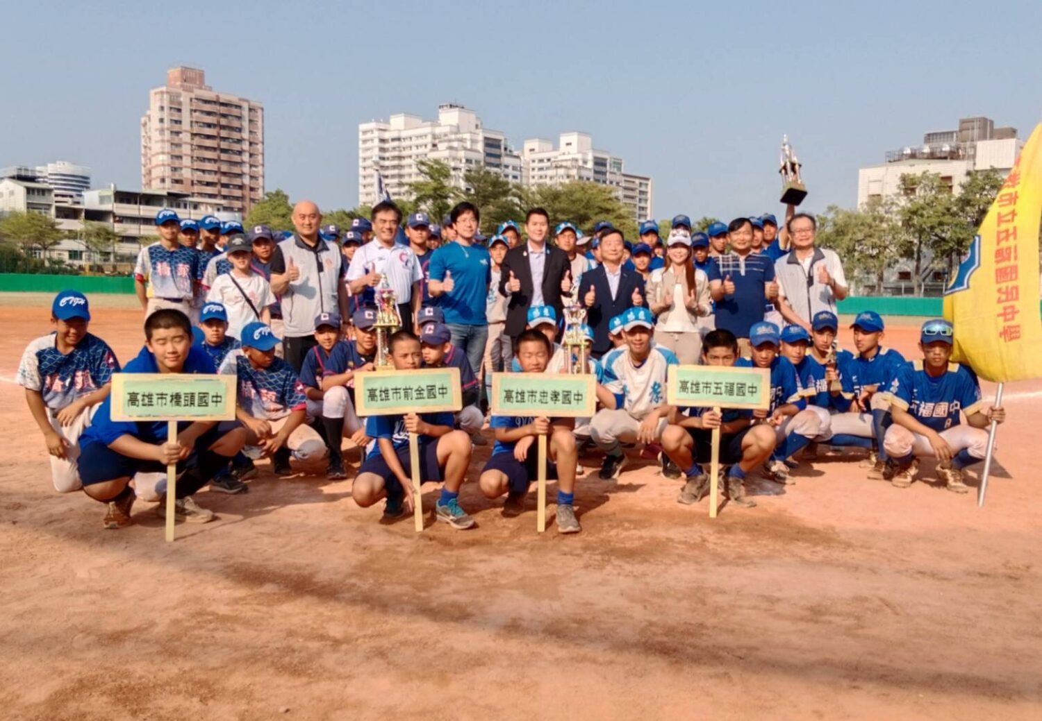 〔今傳媒/記者張忠義報導〕第25屆高雄中區扶輪盃全國青少年棒球邀請賽3月20日開打,歷經三天激烈賽事後,今(22)日中午在陽明棒球場進行冠亞軍之戰,由五福國中一路領先,終場以12:6勝出,抱走冠軍杯及3萬元獎金,忠孝國中屈居亞軍,前金國中在延長賽9:8力克橋頭保住季軍。大會會長、高雄中區扶輪社社長王勛緯在閉幕式中勉勵選手勝不驕、敗不餒,持續追求自己的棒球夢,並當場宣布將推薦冠軍隊五福國中參加今年8月底舉辦的日本倉敷國際青少年棒球邀請賽。