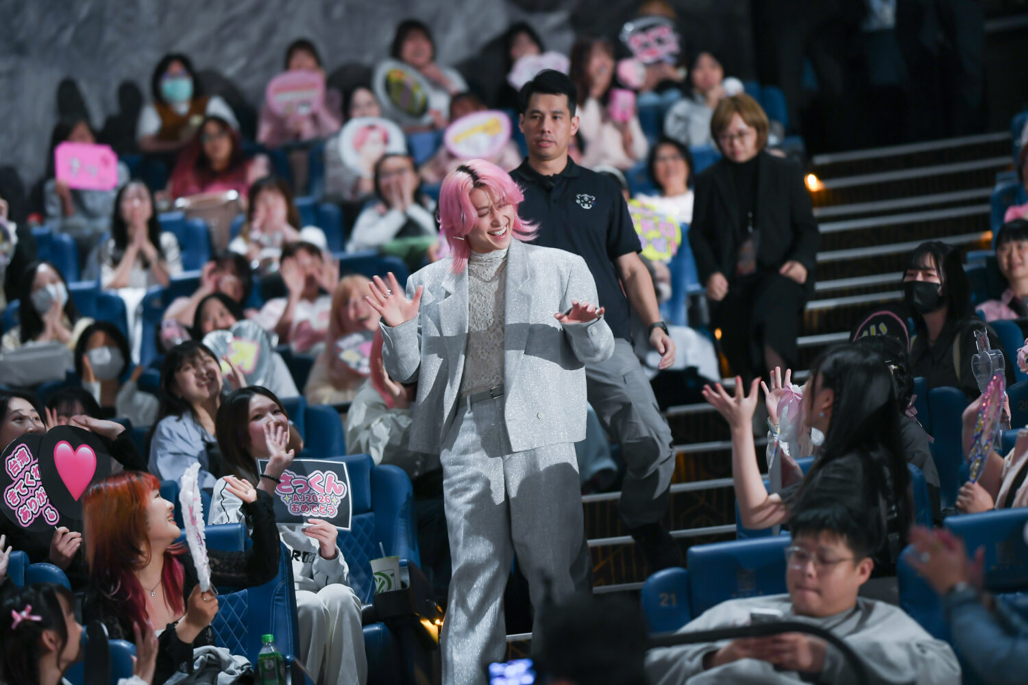 而最讓人印象深刻的,莫過於佐久間大介主動提議的「土味情話」環節,他事先透過片商募集粉絲們希望聽到的甜蜜台詞,再於見面會上親自一句句唸出,從「你是我的珍珠奶茶」、「請以結婚為前提跟我交往」、「不要看別人,只看我」,到改編自台灣偶像劇的經典名言「不要再打了!要打去練舞室打」,每一句都讓粉絲們笑開懷,不斷對著台上的佐久間大介大喊:「卡哇伊!」