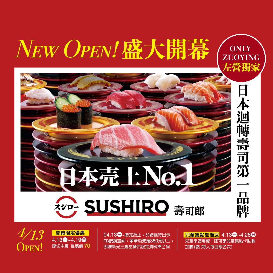 為歡慶壽司郎進駐,新光三越高雄左營店於試營運期間推出多項限定優惠活動,邀請消費者搶先體驗人氣美味。自4/13起,顧客於結帳時出示Facebook按讚畫面,單筆消費滿350元以上,即可獲贈「新光三越高雄左營店限定資料夾」乙個,數量有限,贈完為止;此外,於4/13-4/19期間單筆消費折扣後滿350元以上,即贈送「壽司郎新光三越高雄左營店折價小卡」乙張,限下次用餐使用,消費滿300元以上可折抵40、60、80元,每筆消費限使用一次,且不得與其他優惠併用,使用期限至2026年5月31日止。同時為照顧親子客群,自4/13-4/26,凡12歲(含)以下或國小(含)以下兒童同行用餐,即可享兒童集點卡加贈1點,每人每日限一次。