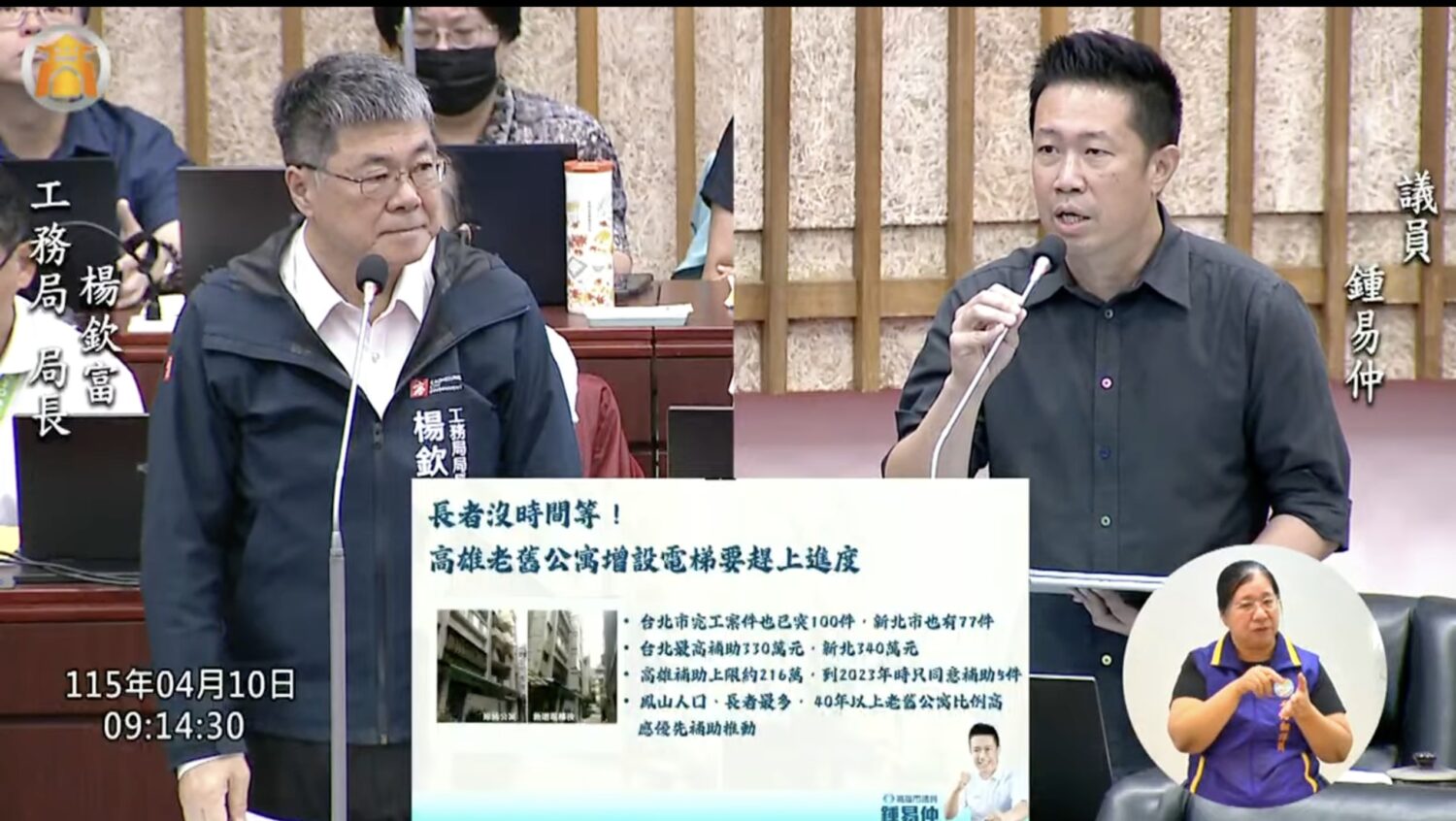 鍾易仲質疑,中央補助條件各縣市相近,高雄推動成果卻長期落後,顯示問題不在制度,而在執行效率。他強調,「一年只有兩件,推動速度根本追不上建築老化速度」,在高齡化趨勢下,沒有電梯的老舊公寓已嚴重影響長者生活品質,市府應更積極協助市民改善居住條件。