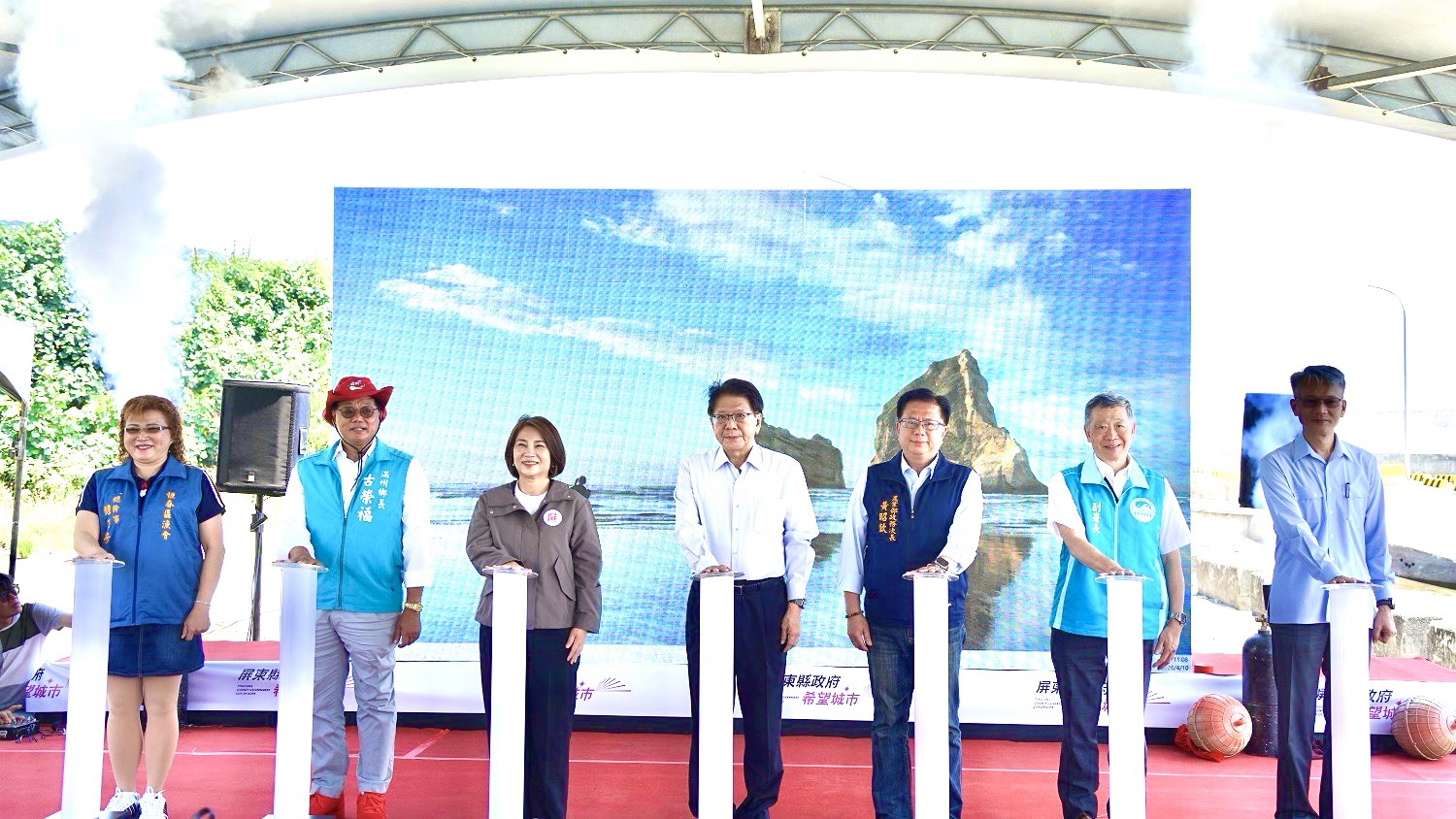 屏東縣政府今(10)日於滿州鄉舉行「興海漁港擴建改善工程」啟用典禮,縣長周春米與總統府秘書長潘孟安、農業部、海洋委員會等中央單位代表、在地漁民共同見證,隨著海巡艦艇與漁船緩緩駛入港區,象徵屏東東南海岸最堅實的守護堡壘正式啟用。漁民們表達高度肯定與感謝,「看到大船在港內守護,真的安心很多」,有了完善港口與海巡進駐,不僅作業更有保障,也讓家人更加放心。