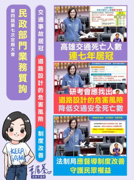 高雄市議員李眉蓁要求要求研考會應主動找出道路設計的危害風險,降低交通安全死亡數的研究對策!