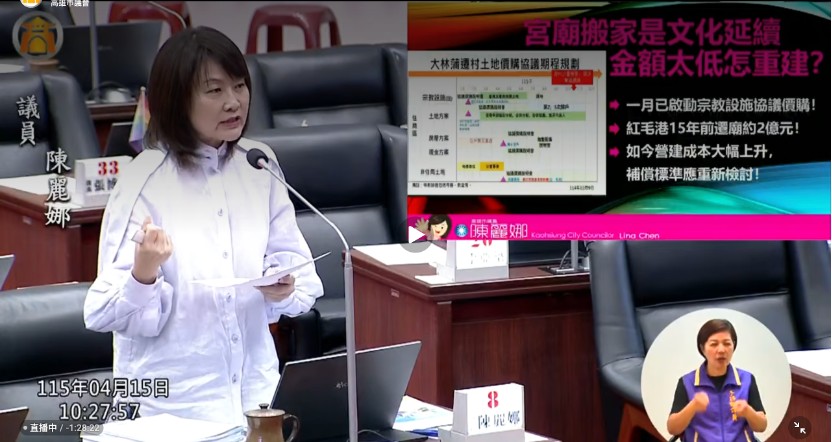 【今傳媒/記者李祖東報導】陳麗娜今(15)日針對大林蒲遷村廟宇補償費、前鎮行政中心遷建可行性進行質詢。大林蒲遷村過程中,廟宇補償金額、遷建經費及都市計畫細部計畫尚未明確,恐影響宗教團體參與協議價購意願與整體進度。尤其鳳鳴宮、鳳林宮及龍鳳宮三大主廟未參加土地預選,更需要民政局正視協助。同時,205兵工廠機一土地是否可作為前鎮行政中心新址,也要求民政局提出具體推動方向。